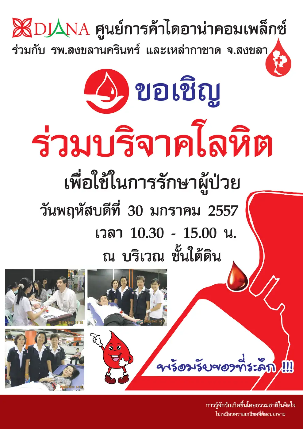 ห้างไดอาน่าหาดใหญ่ร่วมกับ รพ.สงขลานครินทร์ และเหล่ากาชาด จ.สงขลา  ขอเชิญชวนประชาชนผู้สนใจร่วมบริจาคโลหิตในวันที่ 30 มกราคม 2557  ตั้งแต่เวลา 10.30-15.00 น. ณ บริเวณชั้นใต้ดิน ห้า่งไดอาน่า