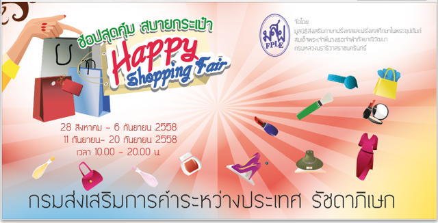 ช้อป..สุดคุ้ม..สบายกระเป๋า ในงานแสดงสินค้างาน "Happy Shopping Fair 2015 " ระหว่างวันที่ 28 ส.ค. - 6 ก.ย. 58 และ 11 ก.ย. - 20 ก.ย. 58 เวลา 10.00-20.00น. ณ กรมส่งเสริมการค้าระหว่างประเทศ