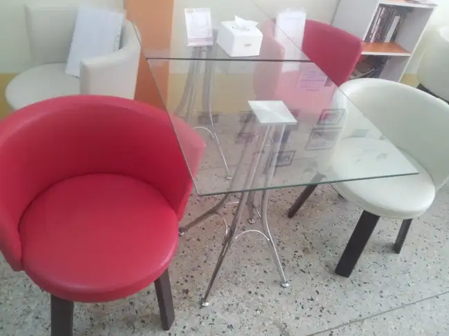 โต๊ะกระจกแบบ 4 ที่นั่ง พร้อมเก้าอี้พนักพิงเข้าชุด (ใต้โต๊ะวางกระเป๋า เมนู หรือนิตยสารได้ ราคาชุดละ 3,500 บาท มี 2 ชุด