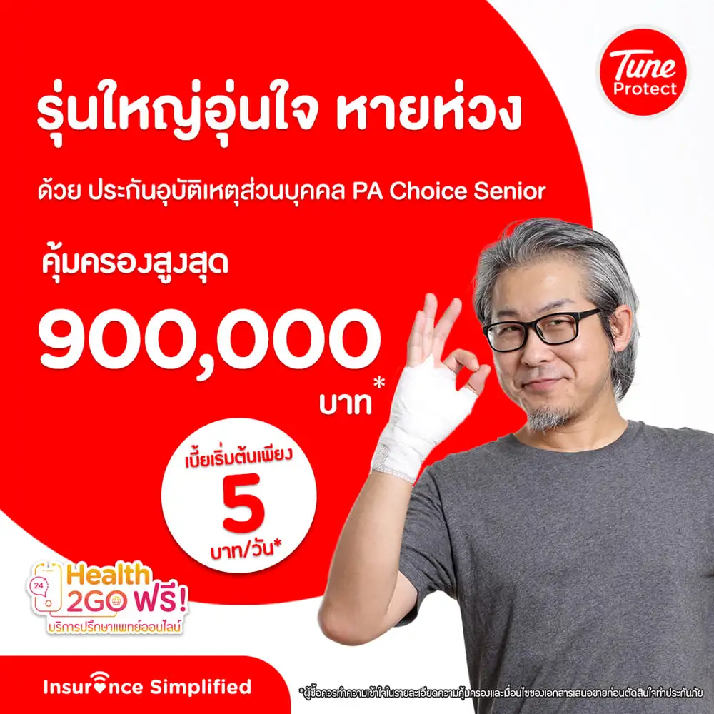 ซึ่งเป็นความคุ้มครองจาก TUNE PROTECT เรามีเเพลนประกันด้วย พีเอช้อยส์ ซีเนียร์ ซึ่งให้ความคุ้มครอง