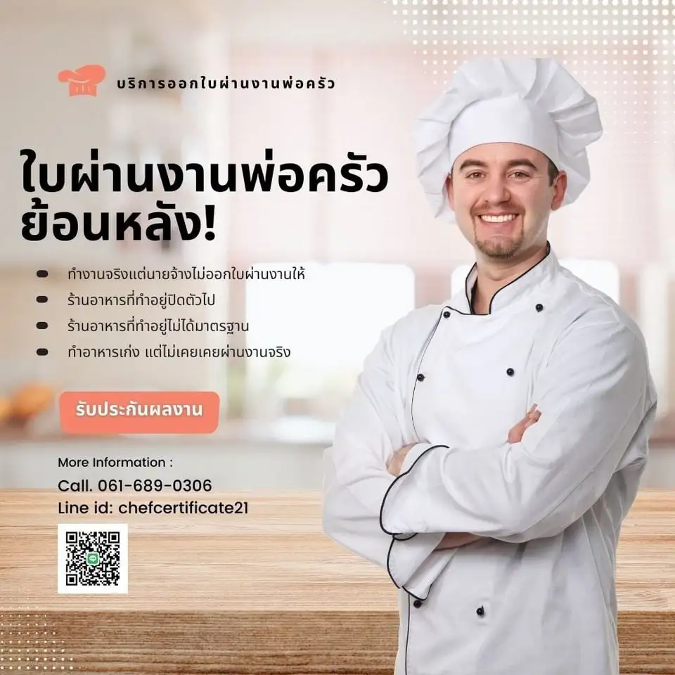ทางเราสามารถช่วยท่านได้เรื่องใบผ่านงานพ่อครัว ทางเราเป็นร้านอาหารจริงประกอบการจริง สถานทูตสามารถตรวจสอบที่ร้านได้เลยครับ สามารถออกใบผ่านงานหรือใบประสบการณ์ ตั้งแต่ 5-10 ปี รับรองจะช่วยให้วีซ่าของท่านได้ง่ายครับสนใจโทร 061-689-0306