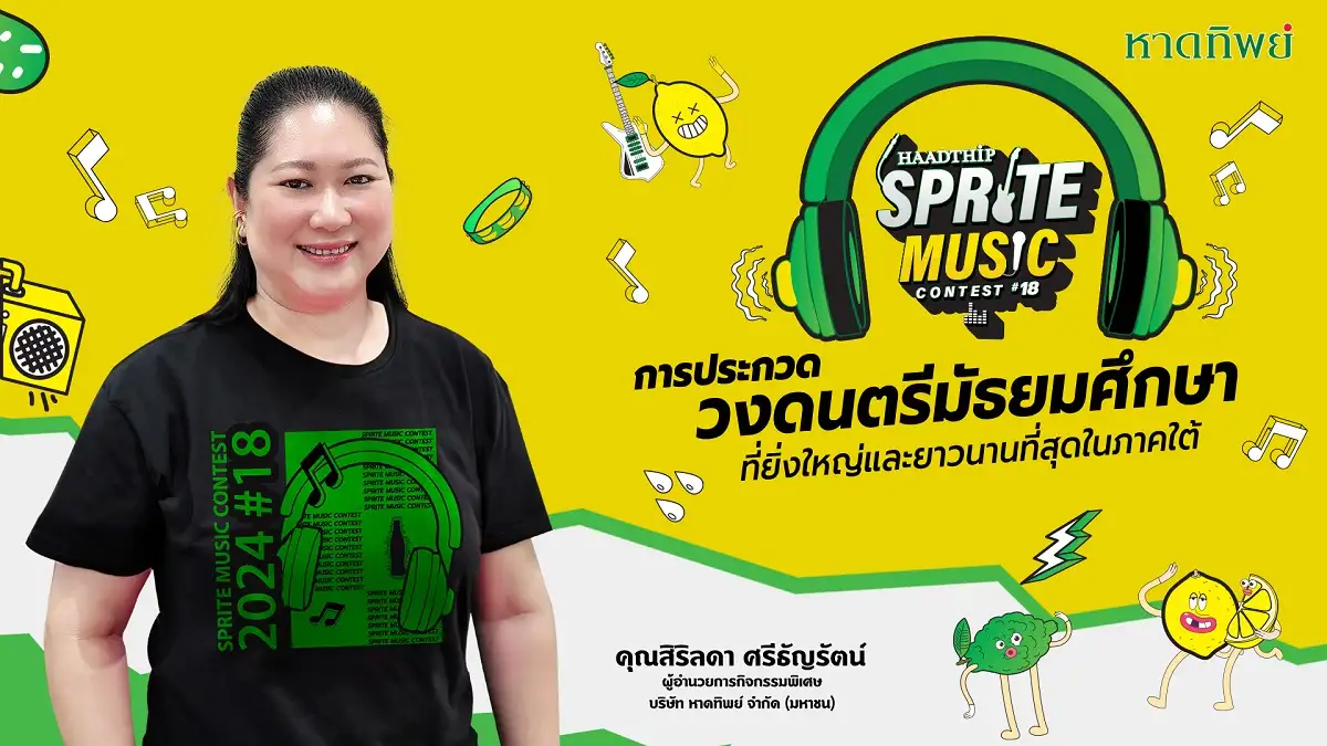 คุณสิริลดา ศรีธัญรัตน์ ผู้อำนวยการกิจกรรมพิเศษ บริษัท หาดทิพย์ จำกัด (มหาชน) เปิดเผยว่า "โครงการประกวดวงดนตรีระดับมัธยมศึกษา Sprite Music Contest ปีนี้จัดขึ้นเป็นครั้งที่ 18 ซึ่งที่ผ่านมามีเยาวชนเข้าร่วมโครงการมากกว่า 4,000 คน โดยหาดทิพย์มุ่งมั่นพัฒนา Sprite Music Contest ให้เป็นเวทีประกวดวงดนตรีระดับมัธยมศึกษา อายุระหว่าง 13-19 ปี ที่มีคุณภาพให้กับเยาวชนในภาคใต้ เพื่อสนับสนุนให้เยาวชนทุกคนใช้เวลาว่างให้เป็นประโยชน์ เพิ่มประสบการณ์และพัฒนาทักษะทางดนตรีจากคณะอาจารย์ ศิลปินที่ได้รับการยอบรับระดับประเทศ