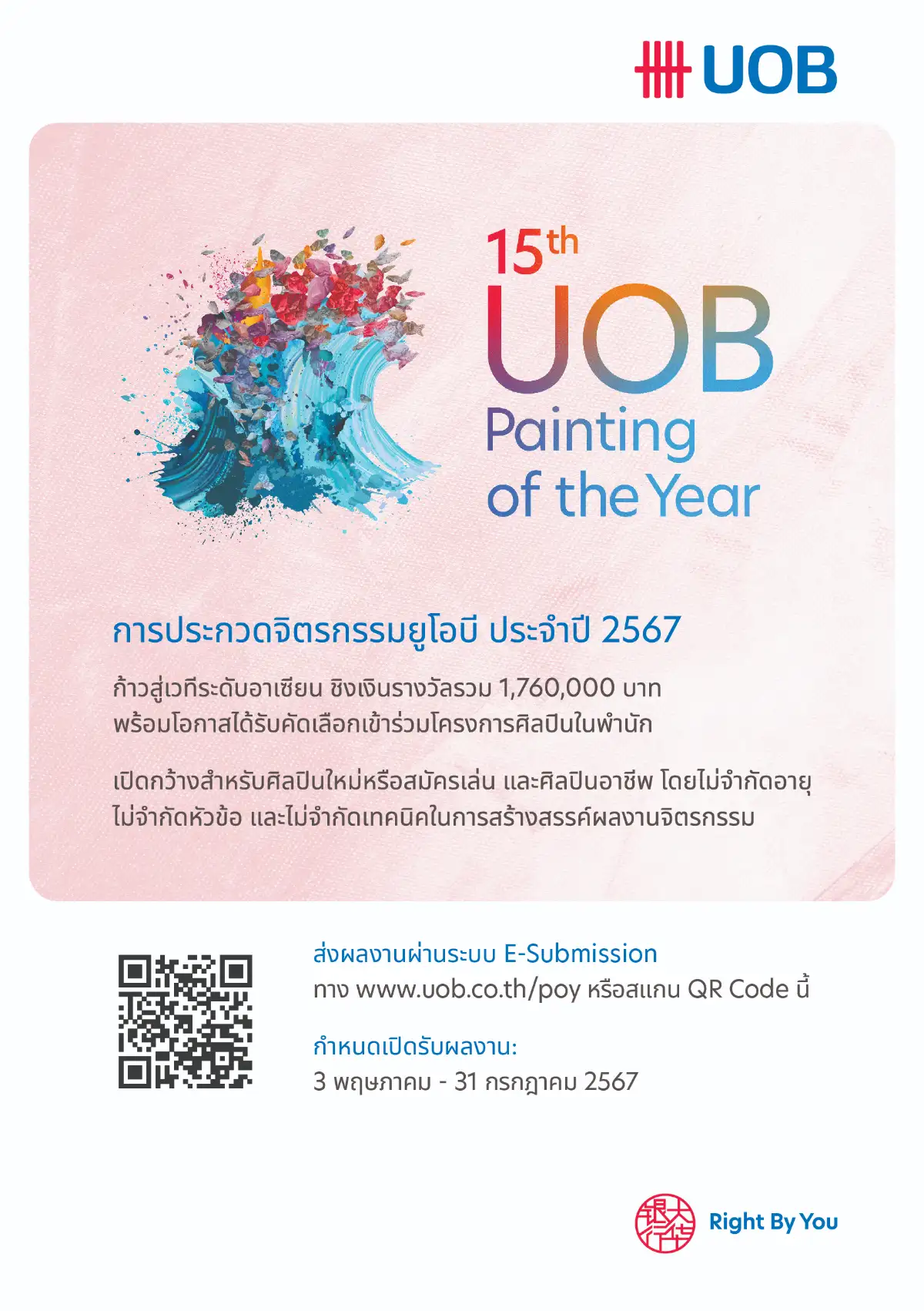การประกวดจิตรกรรมยูโอบี นับเป็นหนึ่งในการประกวดศิลปะที่ได้รับการยอมรับมากที่สุดในภูมิภาคเอเชียตะวันออกเฉียงใต้ โดยที่ผ่านมาได้รับผลงานเข้าร่วมประกวดจากศิลปินมืออาชีพและศิลปินสมัครเล่นจำนวนมากกว่า 1,000 คนทั่วทั้งภูมิภาค สำหรับการประกวดจิตรกรรมยูโอบี ครั้งที่ 15 ในประเทศไทยกำลังเปิดรับผลงานจากศิลปินมืออาชีพและศิลปินสมัครเล่นทุกคน ไม่ว่าจะเป็นศิลปินชาวไทยหรือผู้มีถิ่นพำนักถาวรในประเทศไทย โดยสามารถส่งผลงานทางออนไลน์ ได้ที่ www.uob.co.th/poy การประกวดไม่มีข้อจำกัดด้านหัวข้อและอายุ สามารถส่งผลงานได้ตั้งแต่บัดนี้จนถึงวันที่ 31 กรกฎาคม 2567
