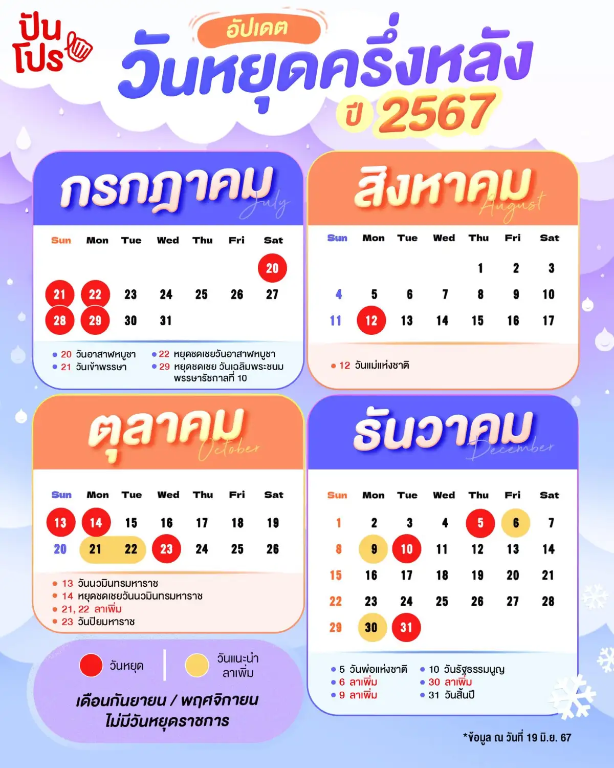 อัพเดตวันหยุดครึ่งปีหลัง ปี 2567