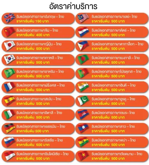 ดำเนินธุรกิจด้านงานแปลเอกสารมาเป็นเวลานาน ทำให้เรามีทีมงานที่มากด้วยประสบการณ์และมีความเชี่ยวชาญในสายงานด้านนี้โดยเฉพาะทั้งทีมงานชาวไทยและทีมงานชาวต่างประเทศเจ้าของภาษา รับแปลภาษา,แปลเอกสาร,แปลภาษา