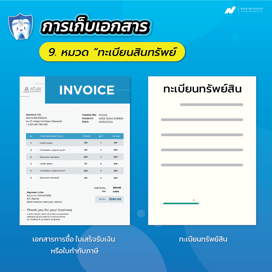 9. หมวด "ทะเบียนสินทรัพย์" สินทรัพย์จะต้องมีอายุการใช้งานเกิน 1 ปี และมีมูลค่าขั้นต่ำ 1,000 บาทขึ้นไป หรือตามนโยบายของคลินิก ซึ่งประกอบไปด้วย