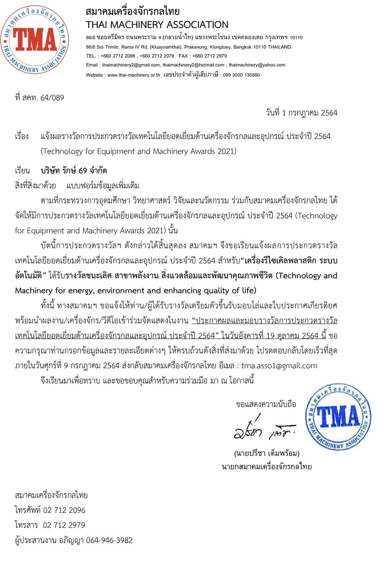 ด้วยรางวัลการันตีถึงประสิทธิภาพยอดเยี่ยมของเครื่องบดพลาสติกของ รักษ์69 "รางวัลชนะเลิศ เทคโนโลยียอดเยี่ยมด้านเครื่องจักรกลและอุปกรณ์ประจำปี 2564 สำหรับเครื่องรีไซเคิลพลาสติกระบบอัตโนมัติ สาขาพลังงาน สิ่งแวดล้อมและพัฒนาคุณภาพชีวิต (Technology and
